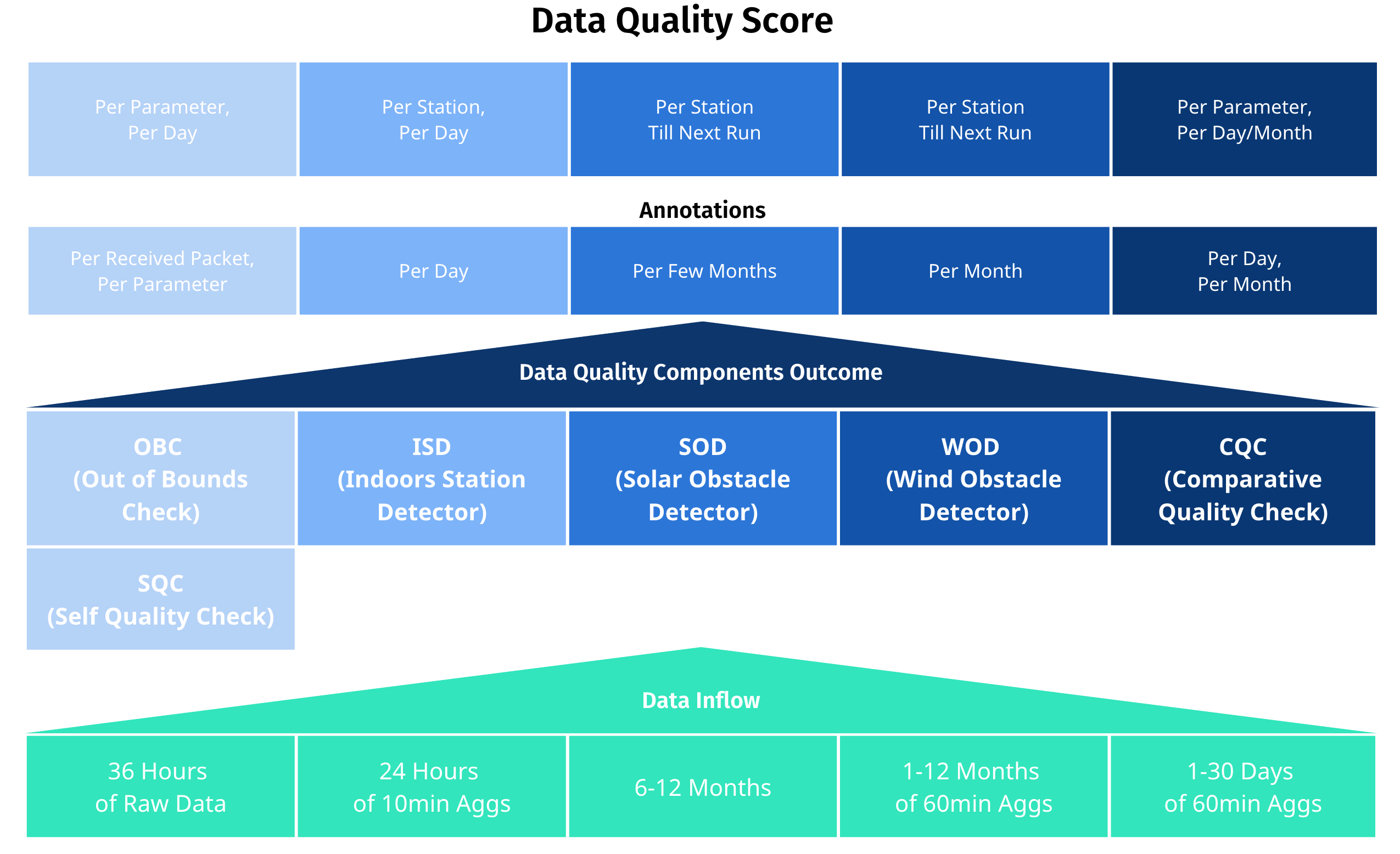 Data Quality is an algorithm that evaluates the quality of weather data provided by a weather station. The calculated score indicates the confidence level in the quality of the weather data received from a station. We need meaningful and usable data and the Data Quality score is an attempt to quantify this metric. The end goal is to encourage weather station owners to do their best to comply with the Network's guidelines in order to consistently achieve the best Data Quality score possible.