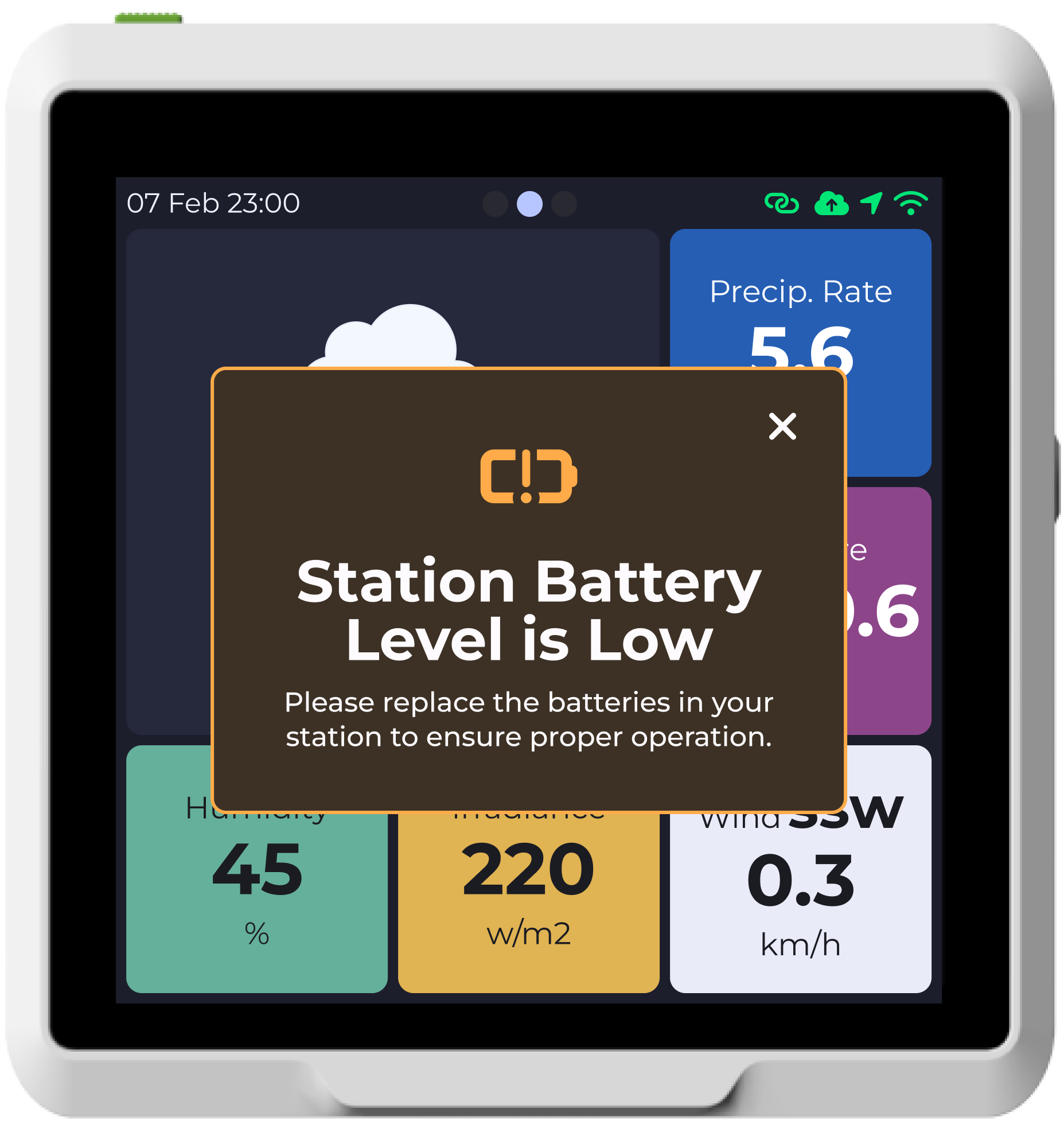 If your WG1200 Gateway displays "Station Battery Level is Low" on the screen, the weather station will run out of battery soon.