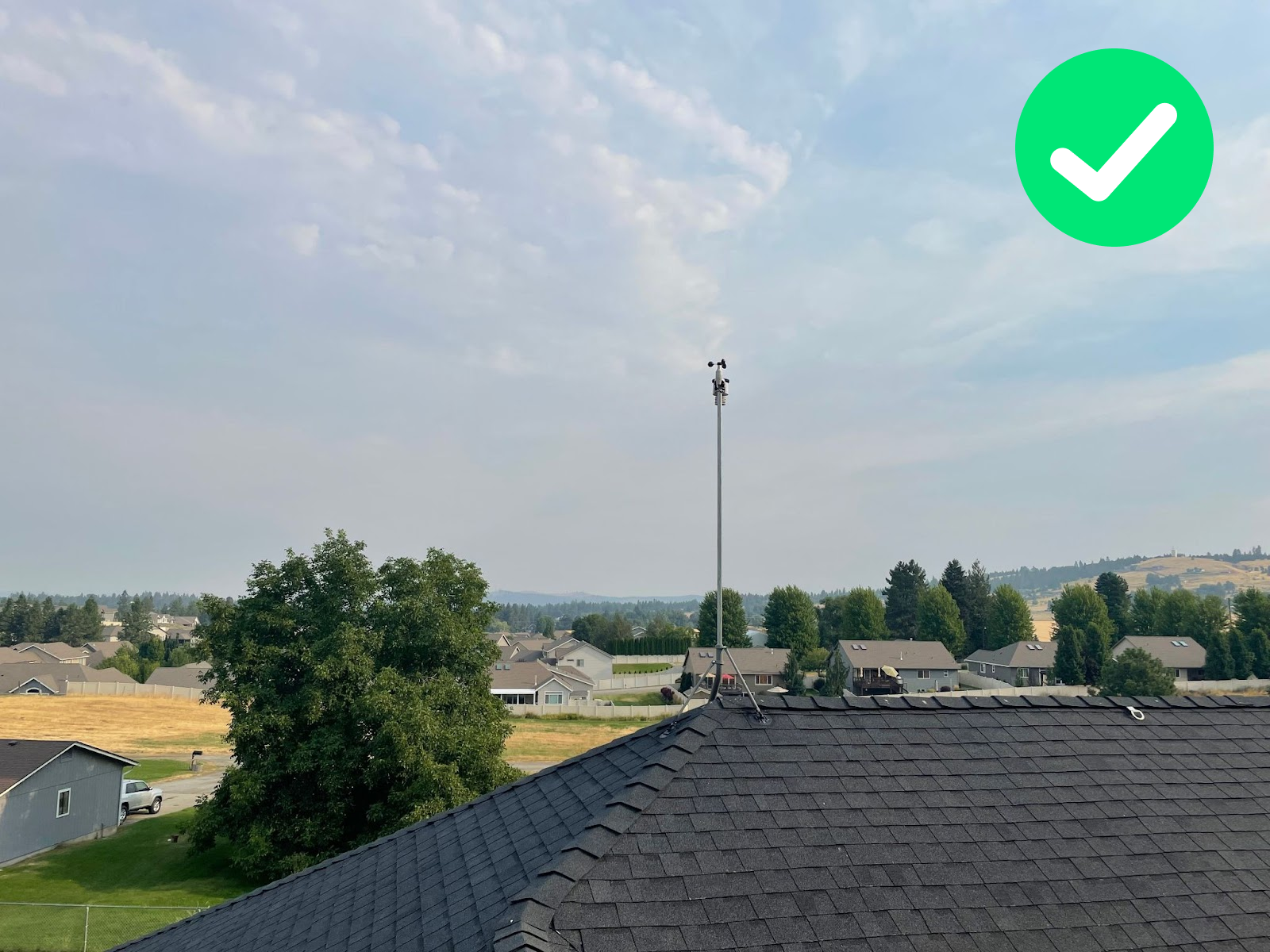 The station is deployed on an appropriate mast, but it is not at the highest possible point of the area (there is a higher building to the north and tall trees to the south). There is also a chimney below it.